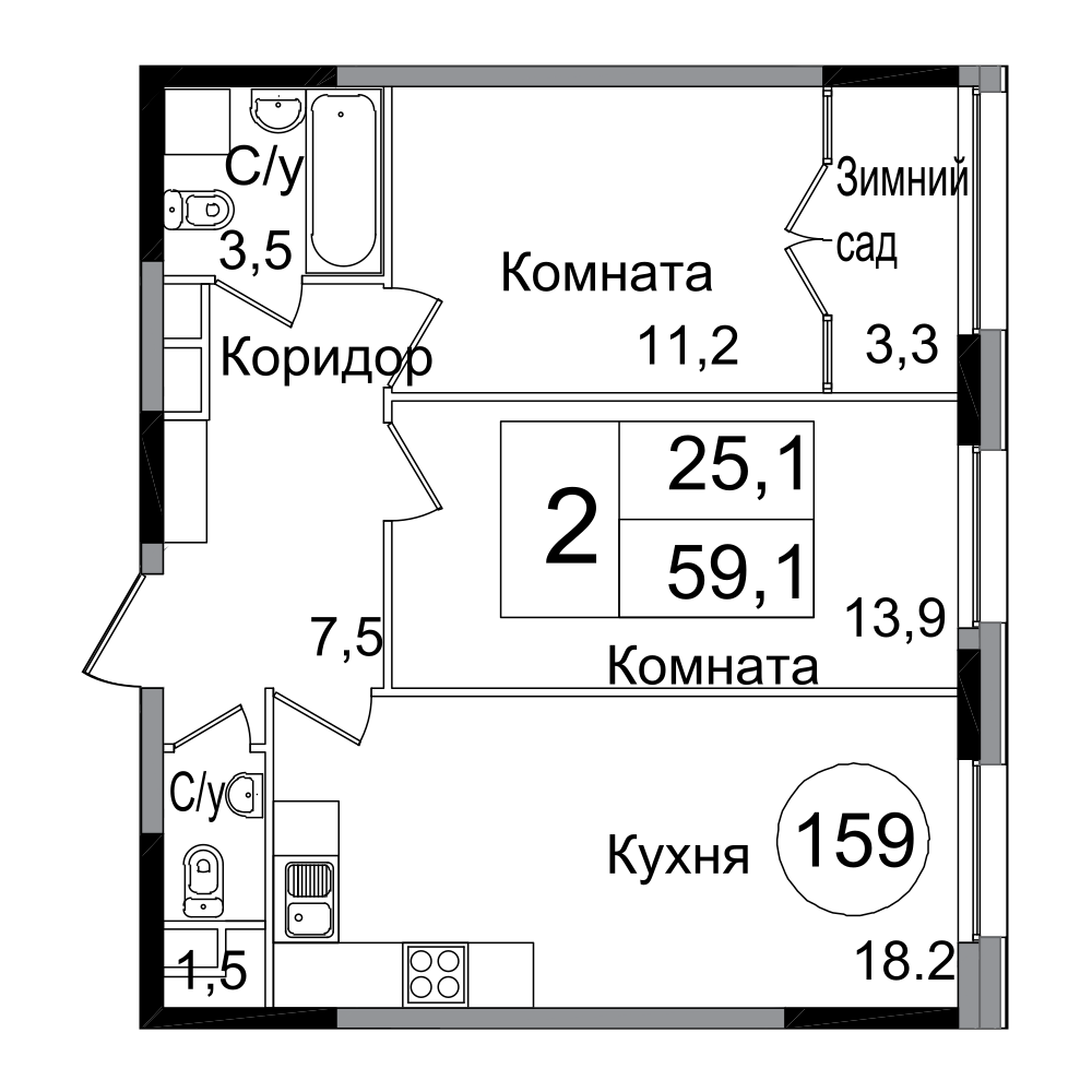 Трехкомнатных квартир всего один вариант (плюс точно такой же в «зеркальном» отображении), где большая комната представляет собой кухню-гостиную с окном и лоджией. В одной из комнат – угловой, два окна. Площади кухонь в трехкомнатных квартирах очень приличные, около 14 квадратов. И здесь, как можно заметить, тоже два санузла.