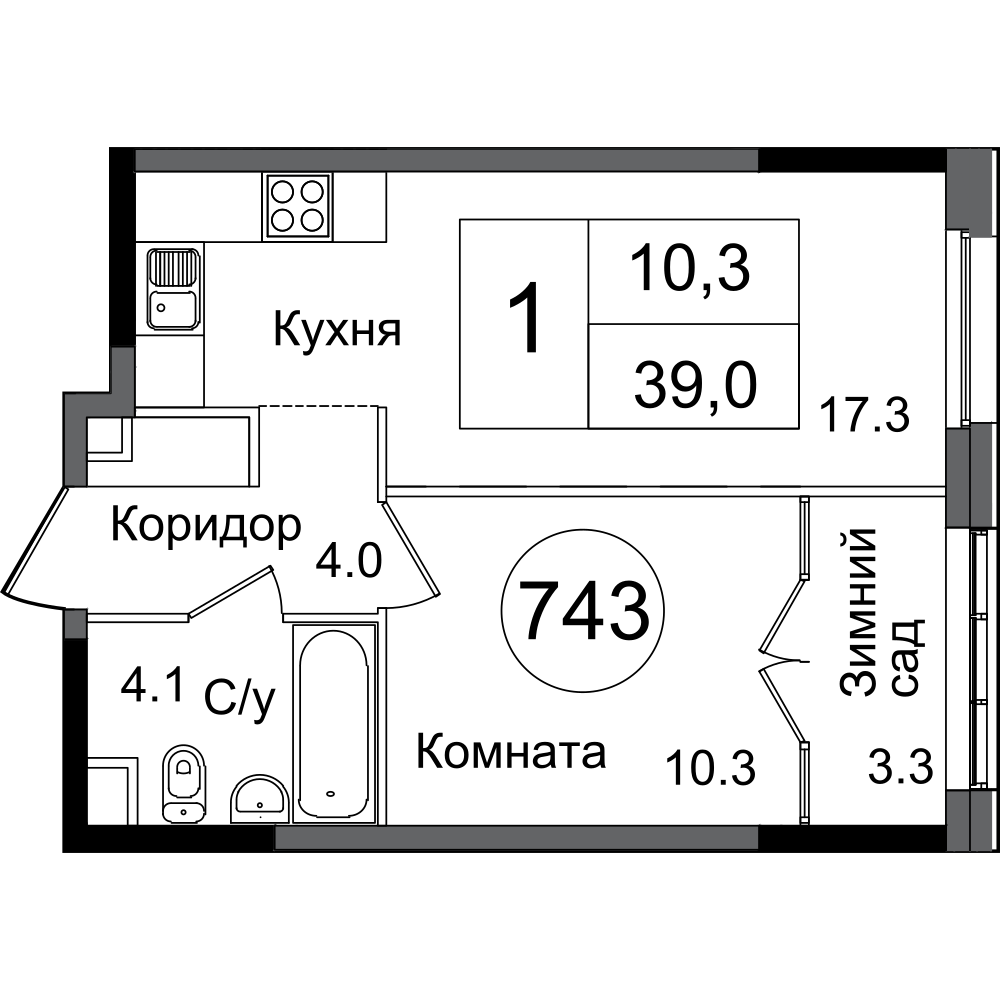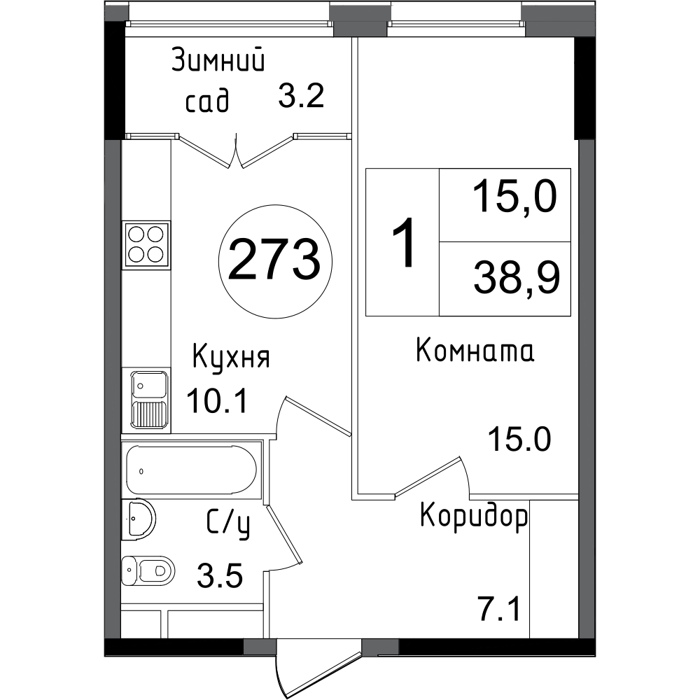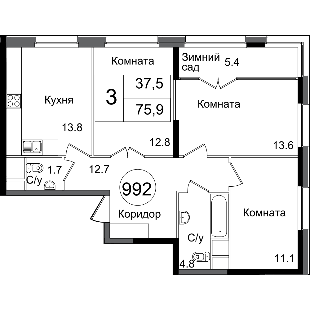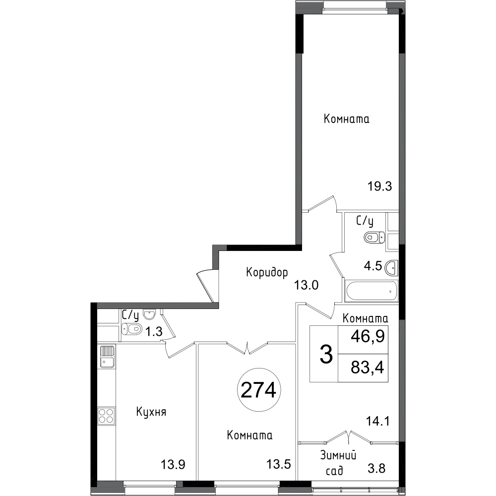 Трехкомнатных квартир всего один вариант (плюс точно такой же в «зеркальном» отображении), где большая комната представляет собой кухню-гостиную с окном и лоджией. В одной из комнат – угловой, два окна. Площади кухонь в трехкомнатных квартирах очень приличные, около 14 квадратов. И здесь, как можно заметить, тоже два санузла.