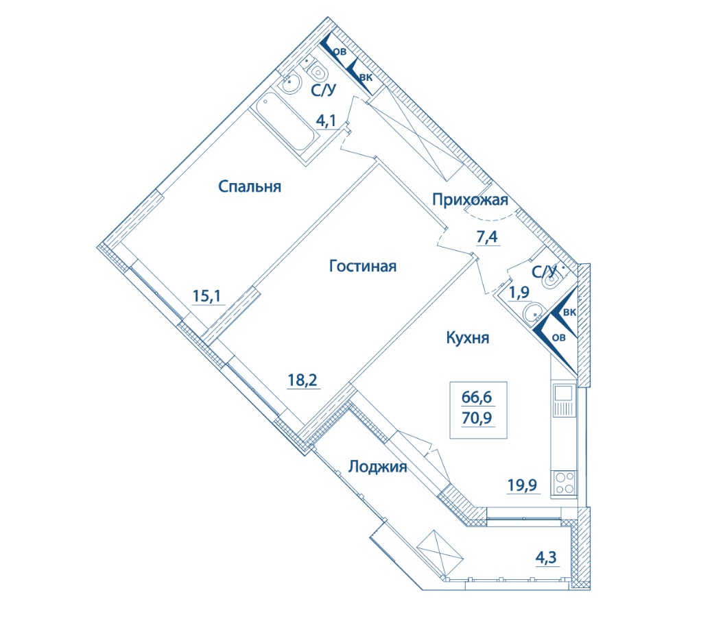 Трёхкомнатных три варианта от 79 и до 103 метров. Две распашонки и окна торцевая с 8 окнами. Самая большая с нестандартной геометрией, так как находится в месте, где дом поворачивает. Примечательна она наличием двух больших лоджий, трех санузлов и двух комнат неопознанной формы.