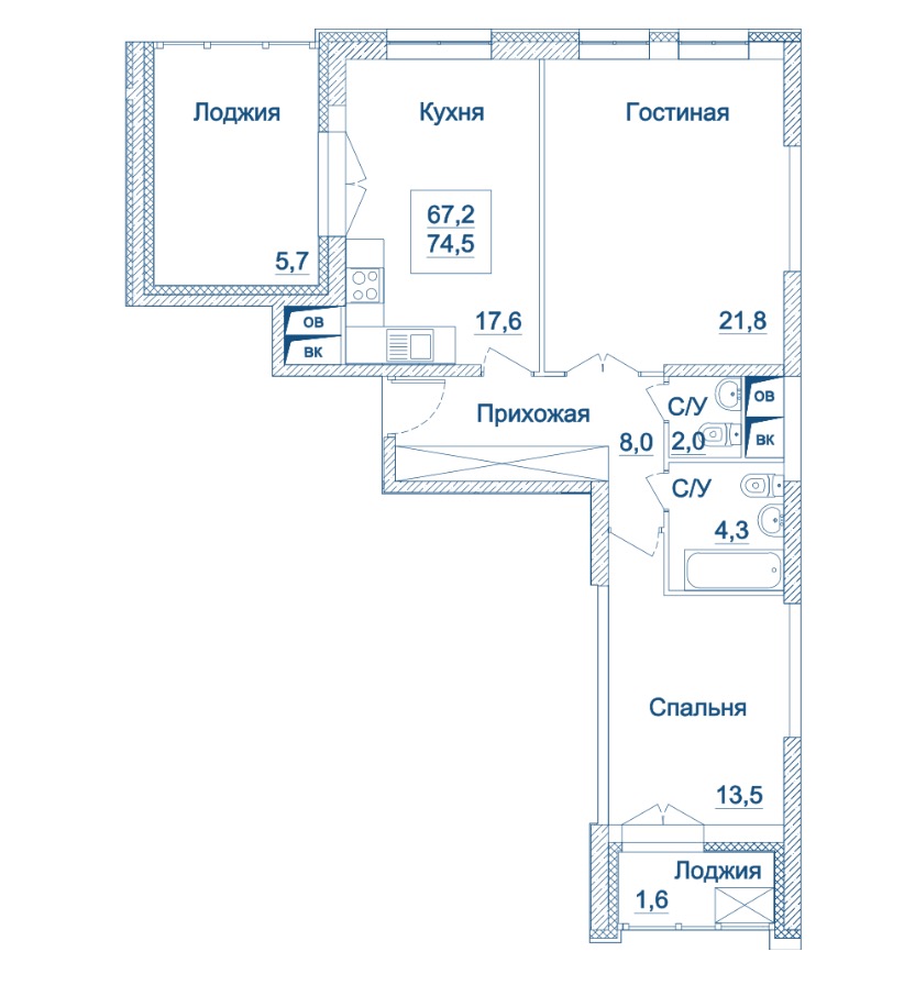 Двухкомнатные представлены как линейными так распашными вариантами от 58 до 74 квадратных метров. Прихожие в них более вместительные от 5,5 до 10 метров, но гардеробные только в трех квартирах и очень скромного размера. Во всех двушках по 2 санузла и почти во всех по две лоджии, некоторые достигают 11,5 метров, что легко позволяет организовать в ней кабинет или чилаут-зону с панорамным остеклением. Кухни от 14 до 20 метров.