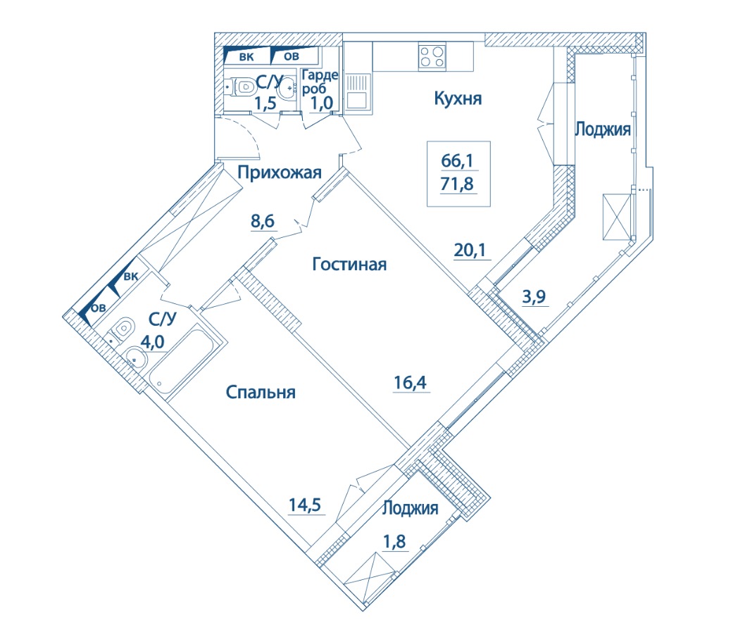 Двухкомнатные представлены как линейными так распашными вариантами от 58 до 74 квадратных метров. Прихожие в них более вместительные от 5,5 до 10 метров, но гардеробные только в трех квартирах и очень скромного размера. Во всех двушках по 2 санузла и почти во всех по две лоджии, некоторые достигают 11,5 метров, что легко позволяет организовать в ней кабинет или чилаут-зону с панорамным остеклением. Кухни от 14 до 20 метров.