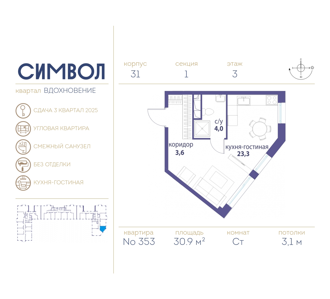 Сентябрь 2023 30.9-54.4 м2 10 434 930 - 22 951 080  ₽ ~391 395  ₽