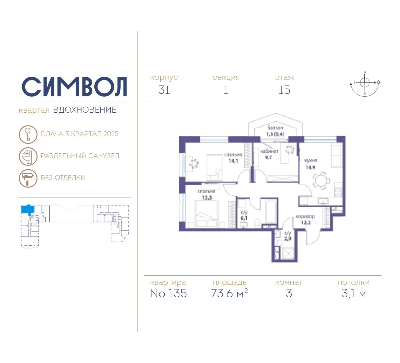 Июнь 2021 25,5-35,1 м2 9 043 132 - 13 115 280  ₽ ~369 307  ₽  17.08%