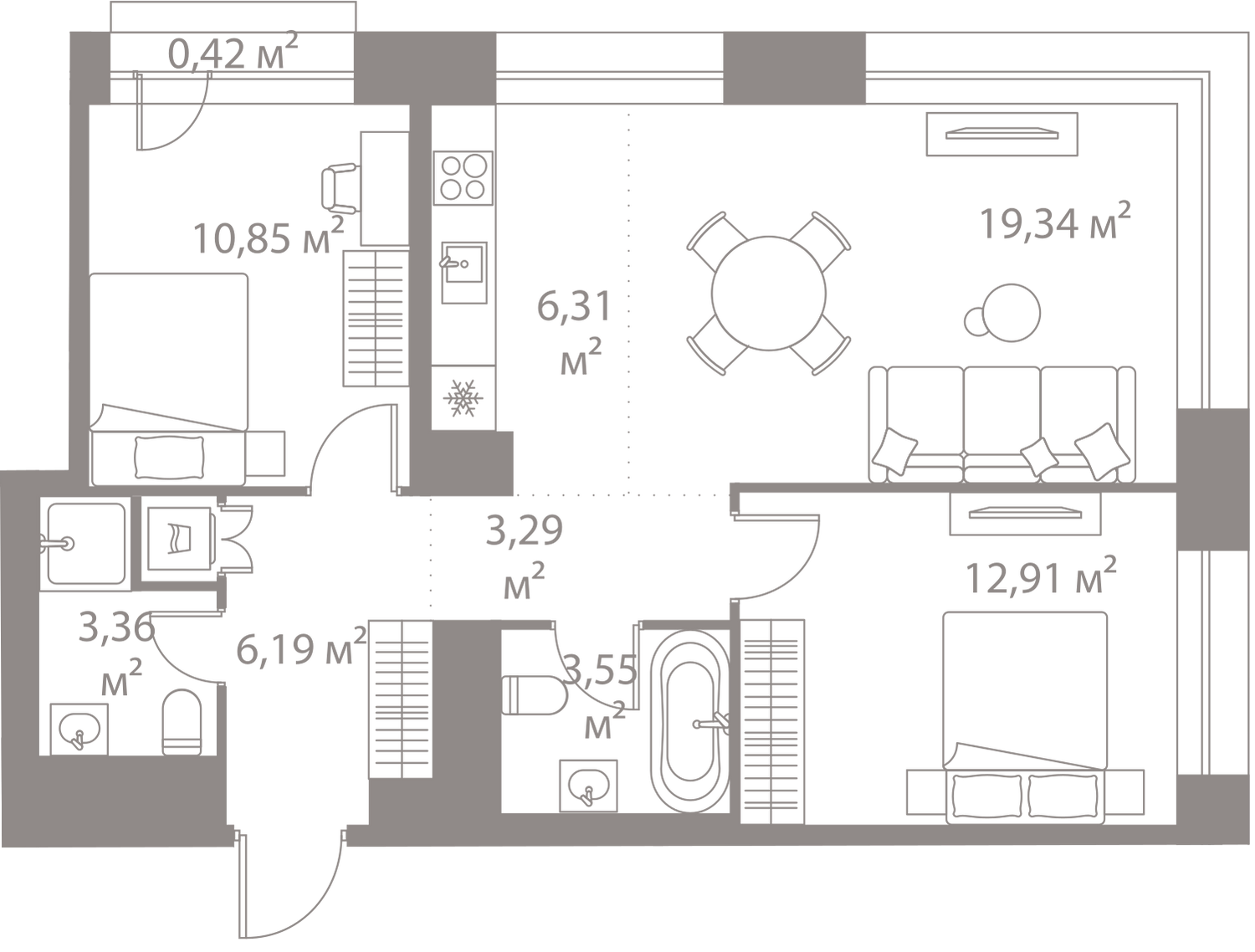 В октябре 2018 в продаже представлены квартиры в четырех корпусах первой очереди № 1, 3, 4 и 5. Это однокомнатные предложения площадью от 42 до 46,65 квадратных метров, двухкомнатные от 62,5 до 68,24 метра и трехкомнатные от 82,15 до 88,92 квадратов. Высота потолков в квартирах 2 метра 85 сантиметров. На подземных этажах запроектированы кладовые помещения площадью до 7 квадратов, которые также можно будет приобрести в собственность.
