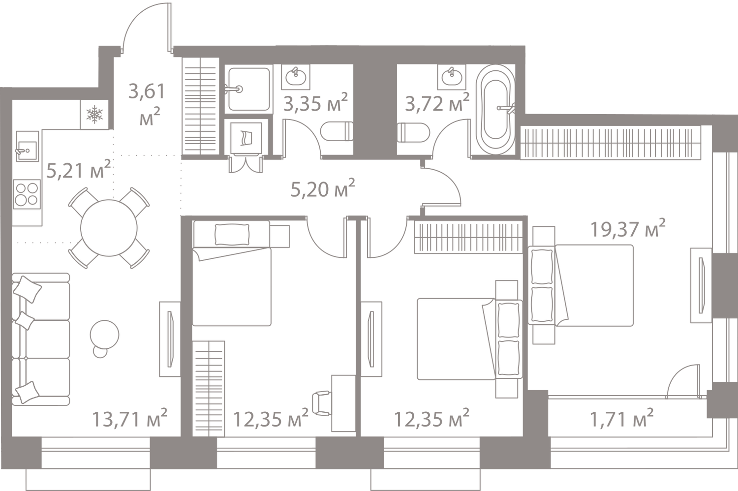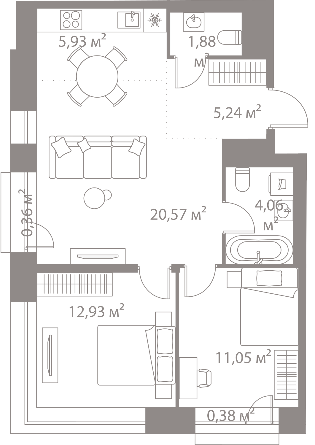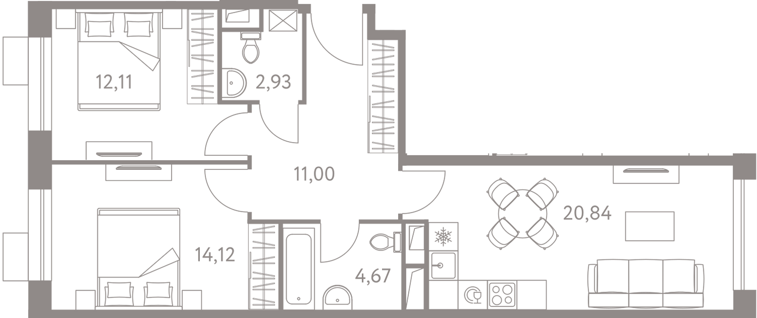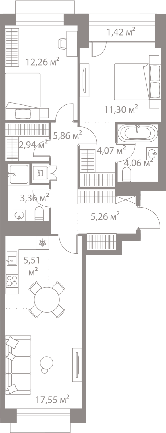 В октябре 2018 в продаже представлены квартиры в четырех корпусах первой очереди № 1, 3, 4 и 5. Это однокомнатные предложения площадью от 42 до 46,65 квадратных метров, двухкомнатные от 62,5 до 68,24 метра и трехкомнатные от 82,15 до 88,92 квадратов. Высота потолков в квартирах 2 метра 85 сантиметров. На подземных этажах запроектированы кладовые помещения площадью до 7 квадратов, которые также можно будет приобрести в собственность.